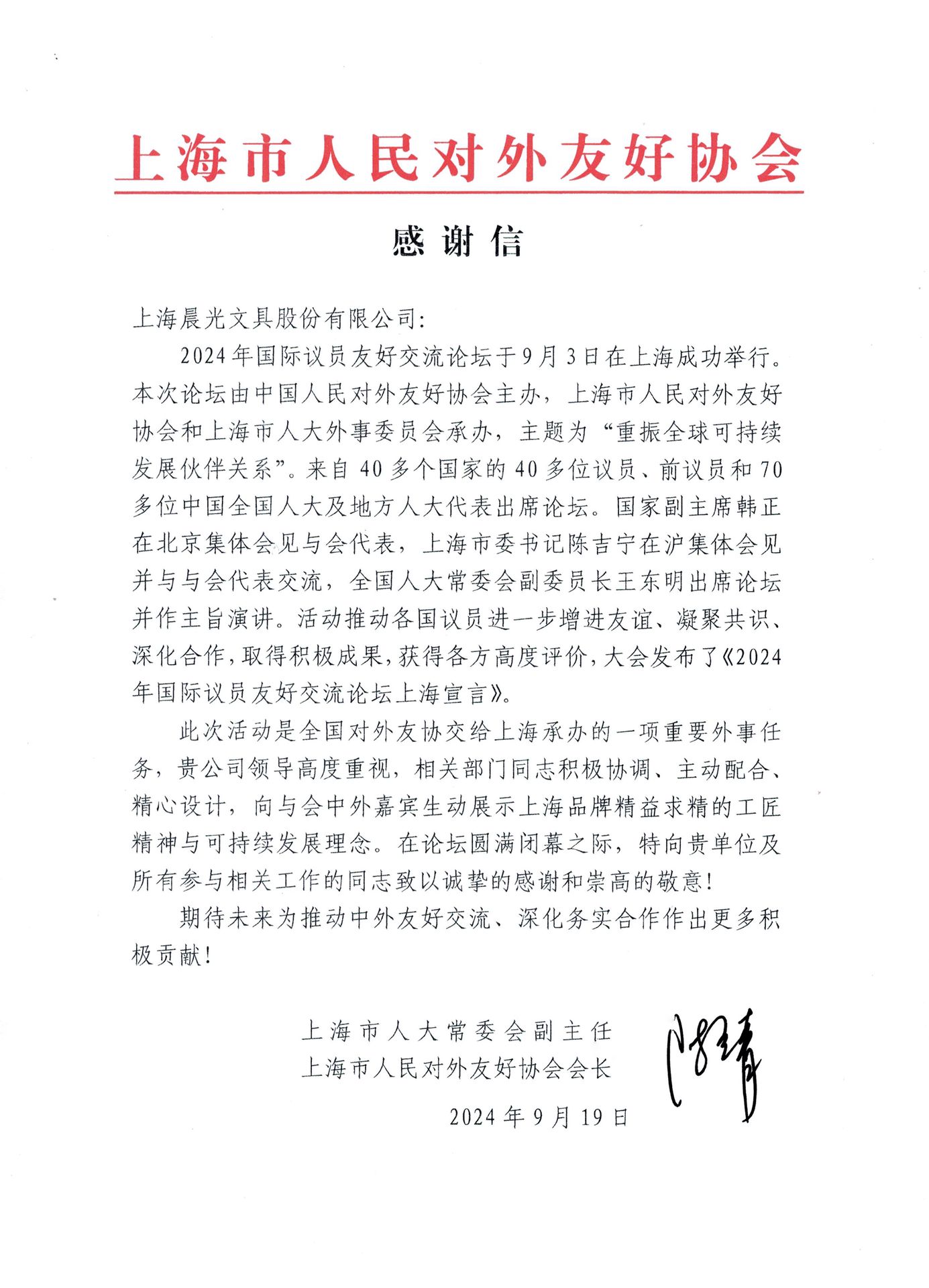 發(fā)布日期:2024-09-299月3日,2024年國(guó)際議員友好交流論壇在上海成功舉行。作為扎根于上海的本土企業(yè)優(yōu)秀代表,晨光以高品質(zhì)文具為2024年國(guó)際議員友好交流論壇保駕護(hù)航。近日,晨光收到來(lái)自活動(dòng)承辦單位上海市人民對(duì)外友好協(xié)會(huì)發(fā)來(lái)的感謝信,信內(nèi)向協(xié)同論壇活動(dòng)的企業(yè)致以誠(chéng)摯的感謝和崇高的敬意。
