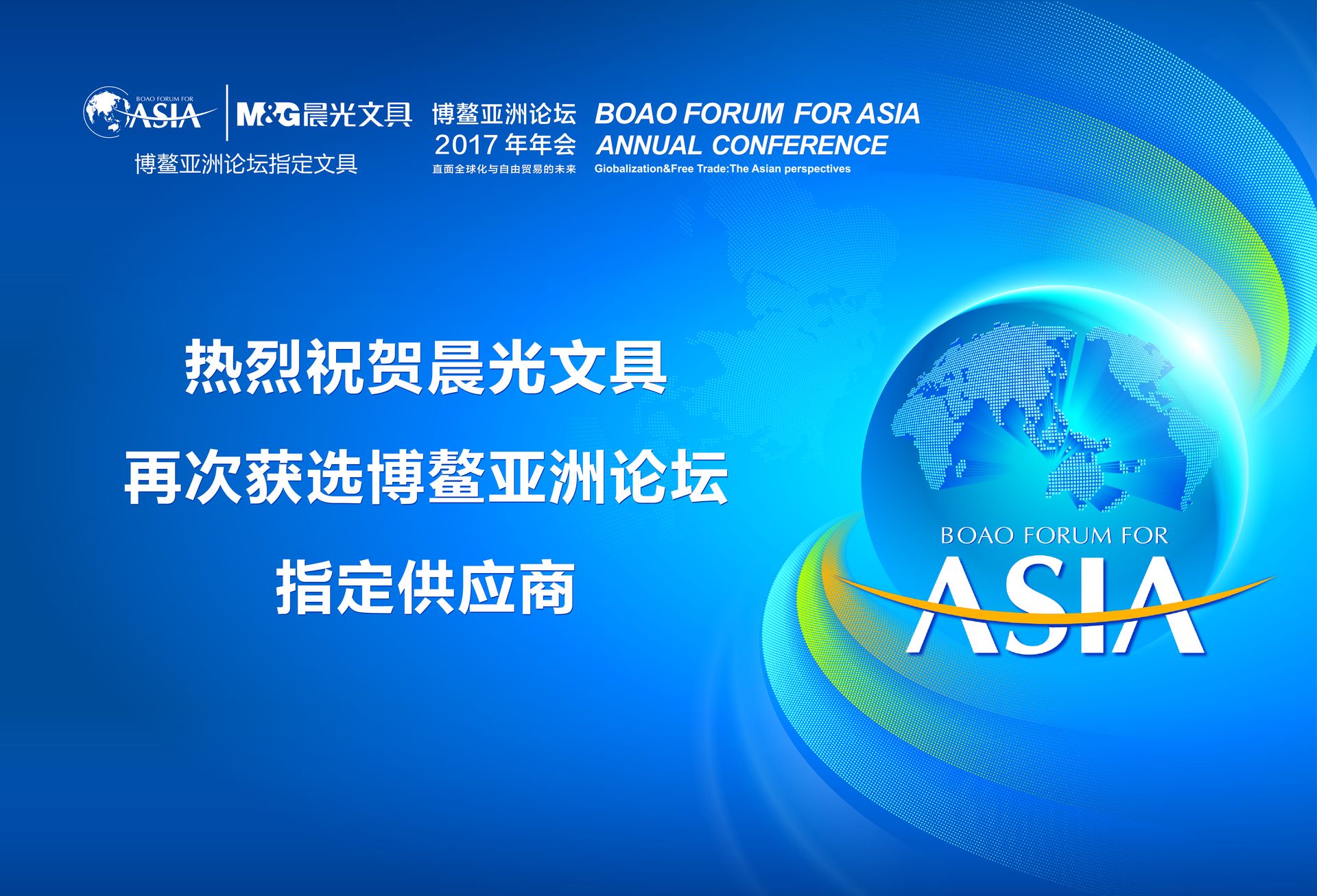 2017年3月23日,以“直面全球化與自由貿(mào)易的未來”為主題的博鰲亞洲論壇正式開幕。作為論壇指定文具供應(yīng)商,此次是晨光文具持續(xù)十一年助力博鰲為大會組委會及參會的政商人士提供專業(yè)會務(wù)文具,再敘創(chuàng)新發(fā)展新篇章。晨光文具董事長陳湖文先生應(yīng)邀參加了此次論壇。